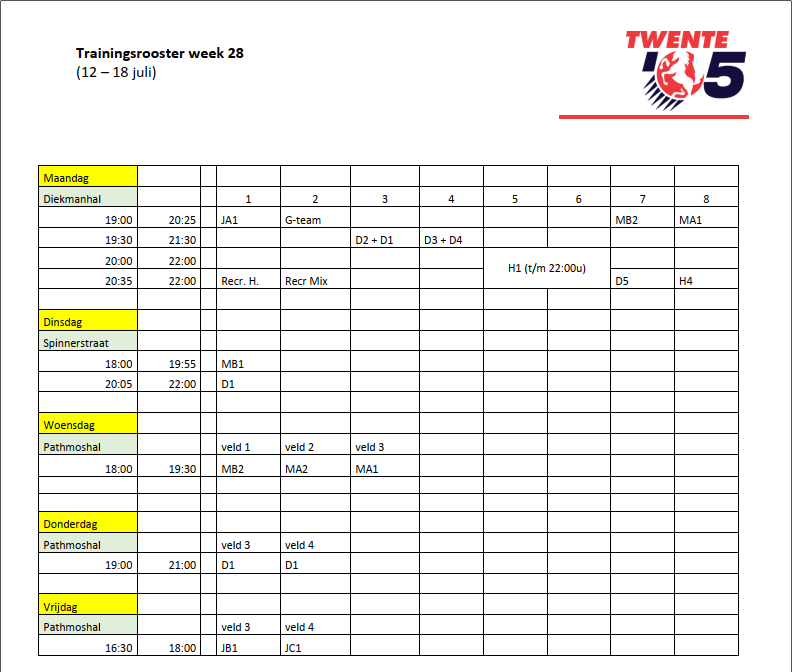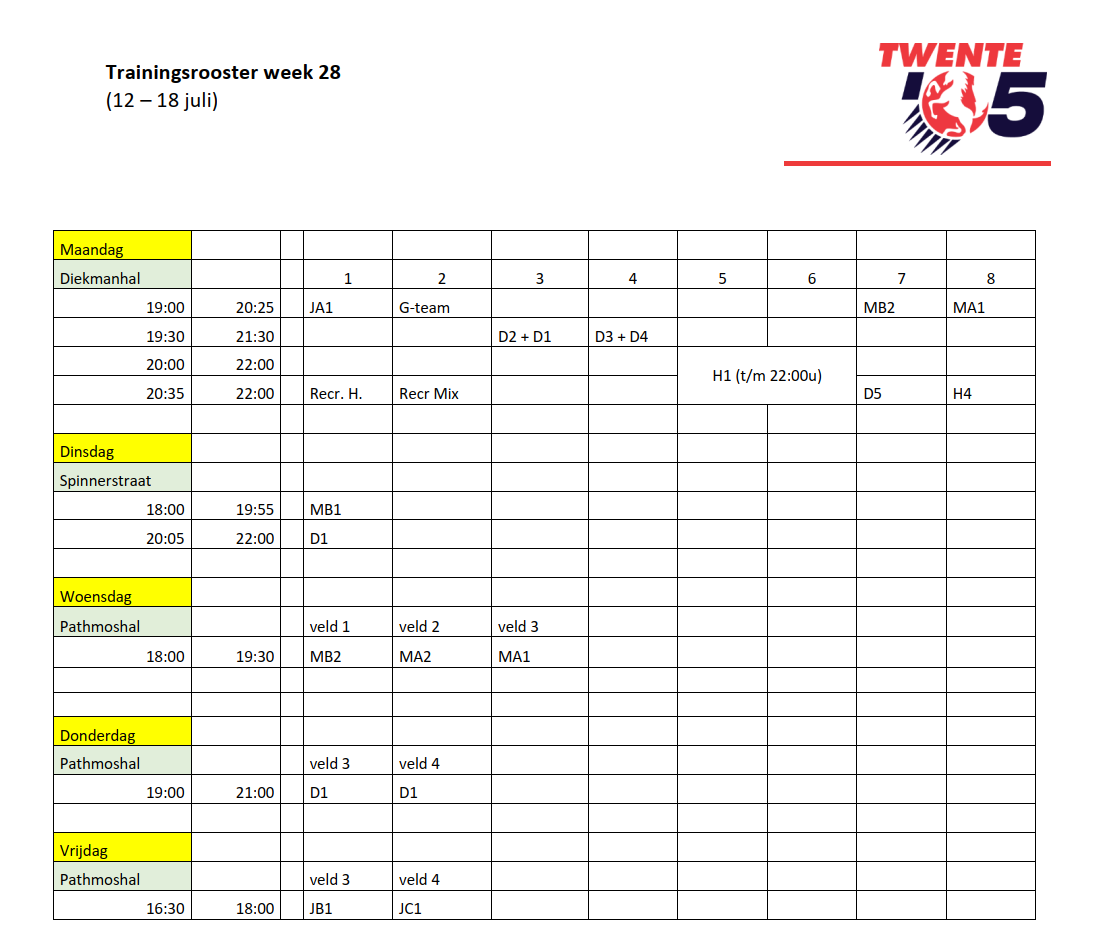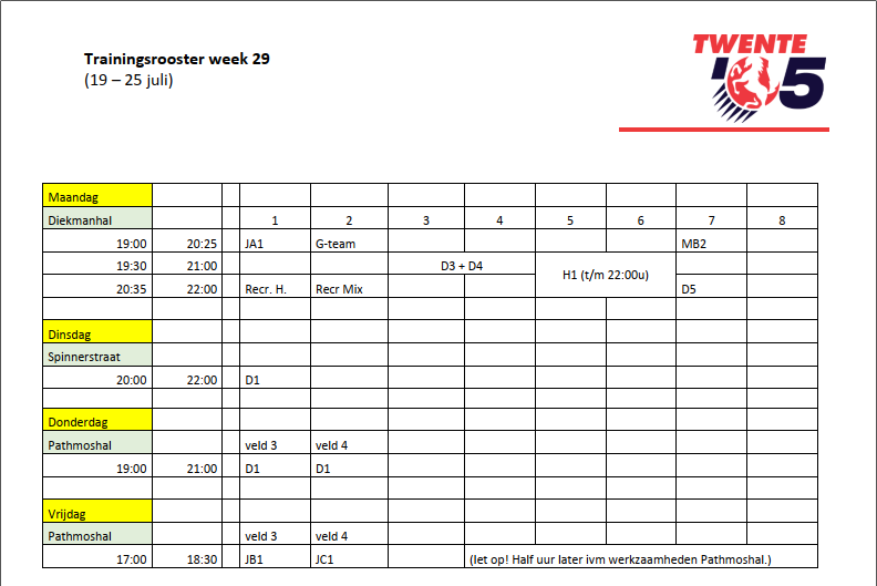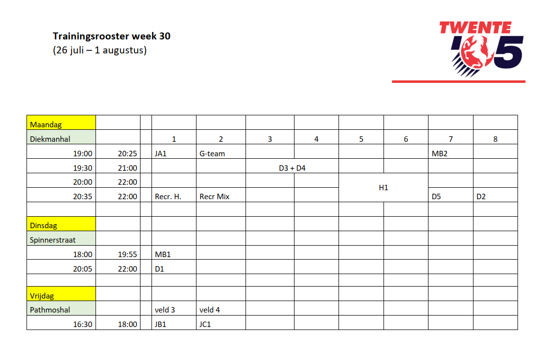 De roosters voor de resterende 3 vakantieweken volgen later. We hebben in die weken niet de beschikking over de Diekmanhal. Een deel van de trainingen zullen waarschijnlijk daardoor verschuiven naar de dinsdag.