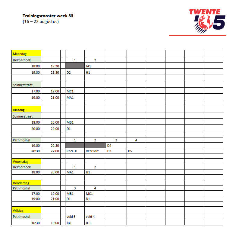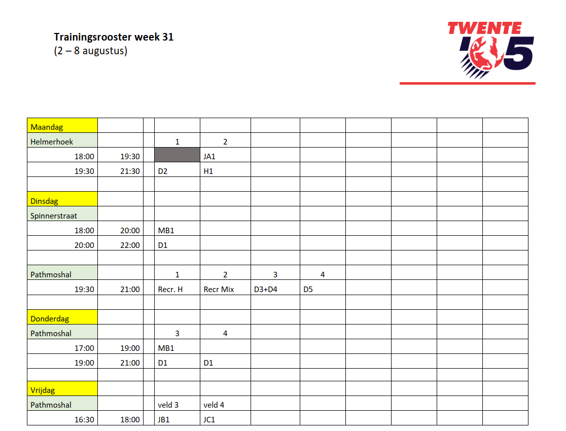 In de laatste 3 weken van de zomervakantie kunnen we helaas niet beschikken over de Diekmanhal. Een deel van de trainingen zijn daarom naar de dinsdag verschoven. We kunnen dan in de Pathmoshal terecht.