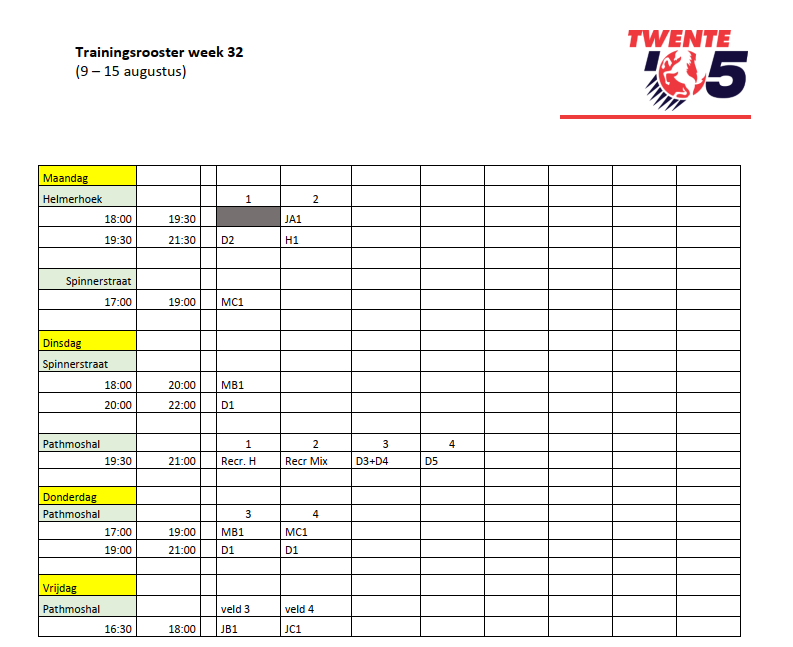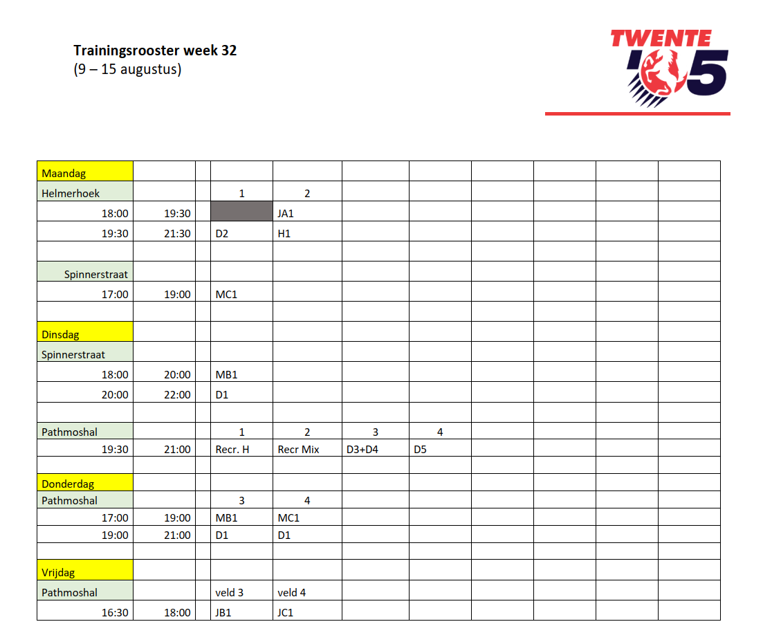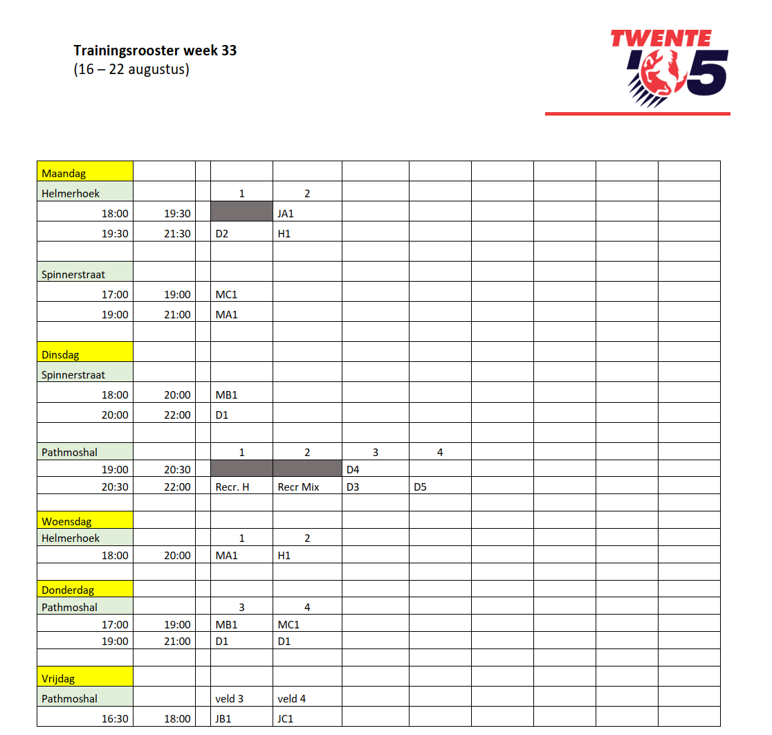 Omdat niet elke week dezelfde teams aanwezig zijn heeft dit ook nu weer geleid tot een specifiek trainingsrooster per week.