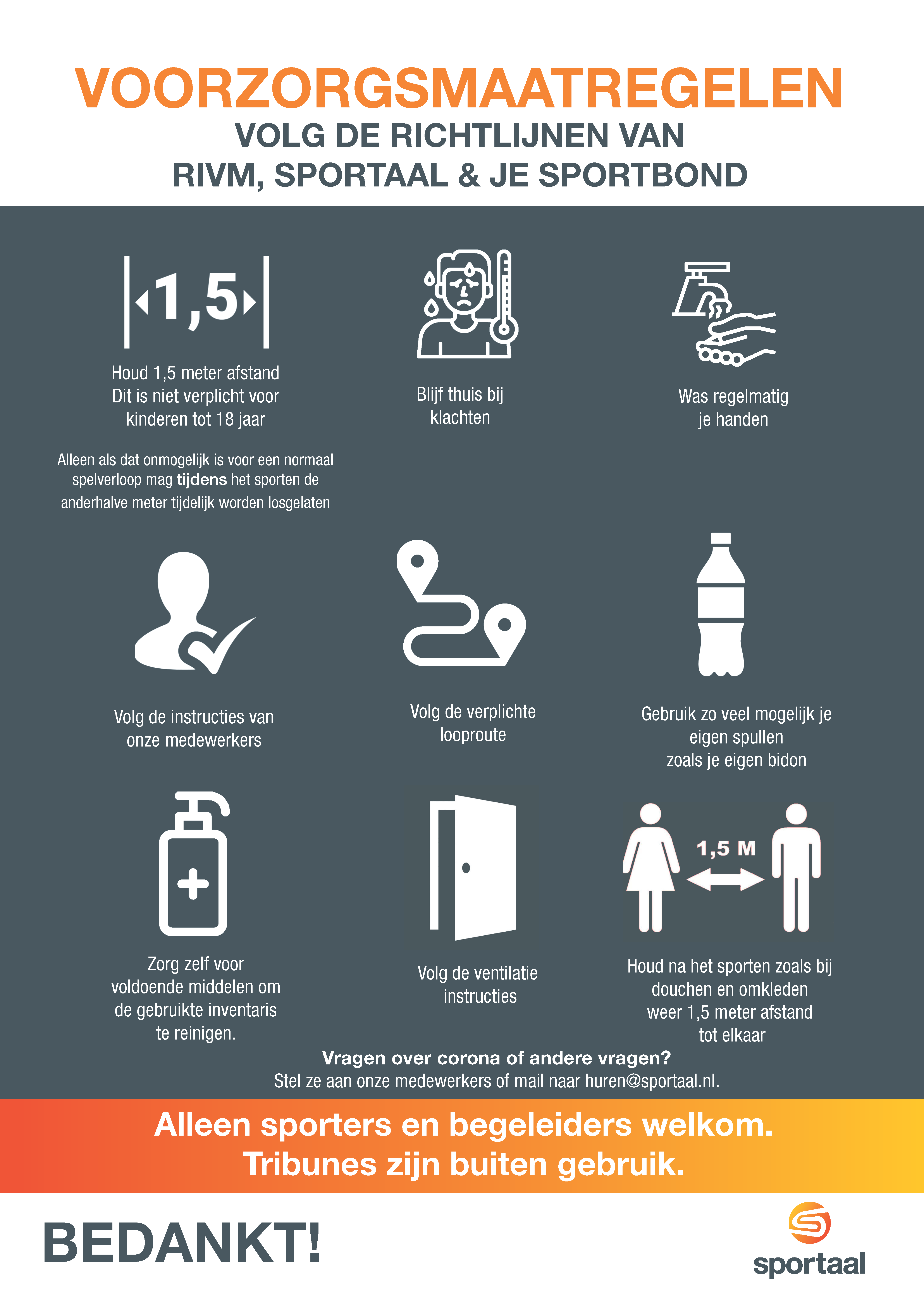 Sportaal heeft een poster gemaakt met daarop de belangrijkste voorzorgsmaatregelen.