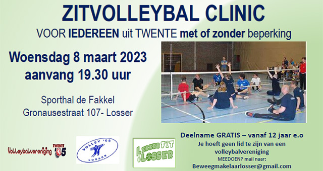Woensdag 8 maart a.s. organiseren Twente '05 en Volley '68 (Losser) een gratis zitvolleybalclinic in Sporthal De Fakkel in Losser.
